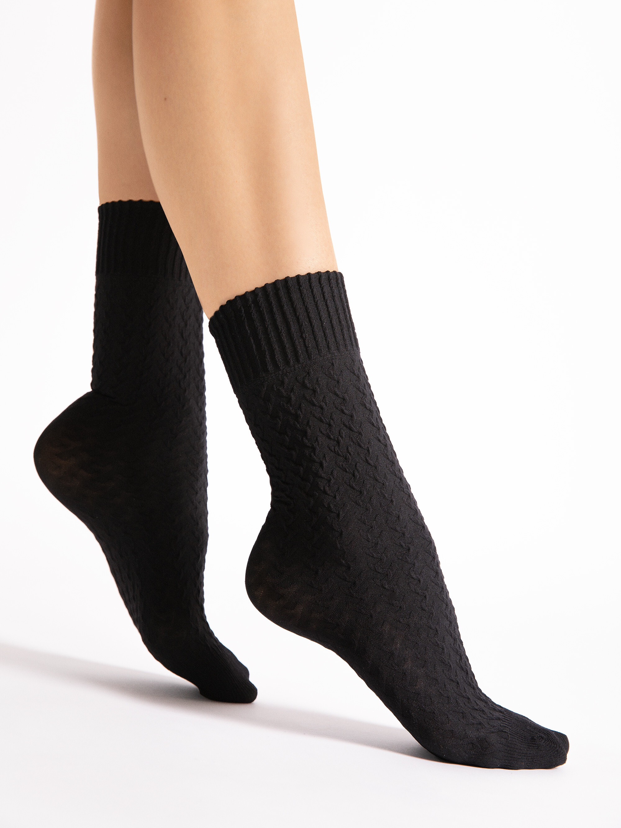 Blickdichte Söckchen mit Zopfmuster und einem bequemen, nicht einschneidenden Abschlussbund. Mit verstärkter Fußspitze, 60 DEN.