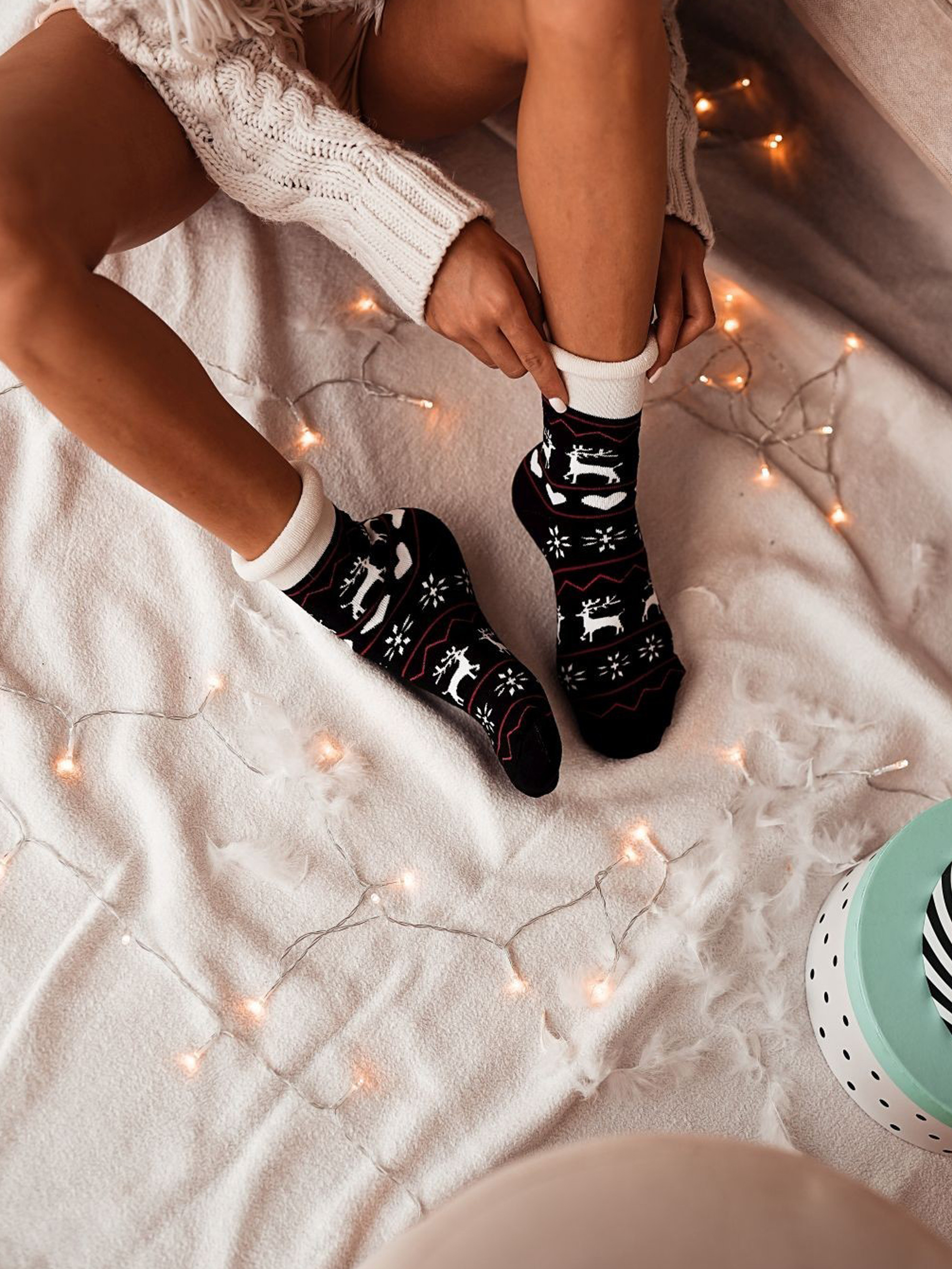 Socken mit wunderschönem, weihnachtlichem Muster mit Rentieren, Schneeflocken und Herzen. Angenehm weich dank dem hohen Anteil an Baumwolle und Frotteefutter. Komfortabler, druckfreier Rollrand. Spüren Sie den ganzen Winter über die Weichheit, den Komfort und die Wärme.
