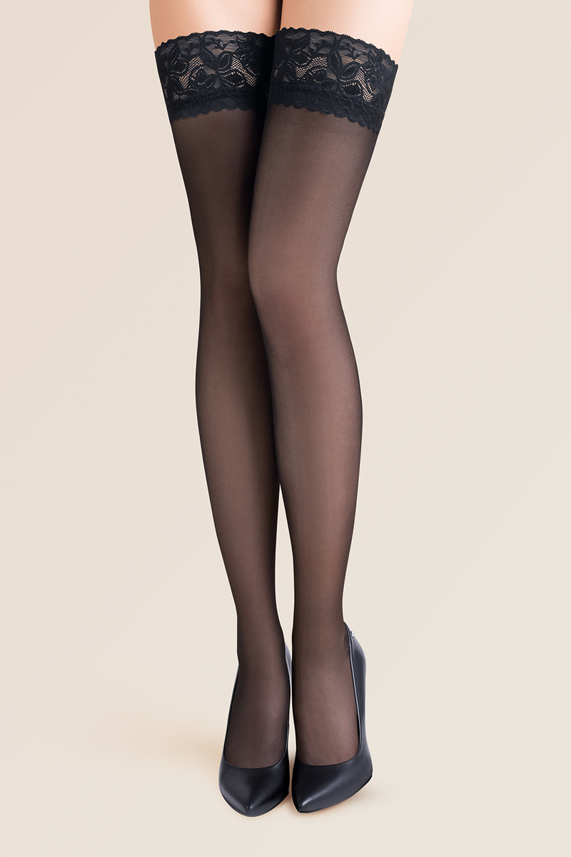 Halterlose Feinstrümpfe, klassisch, elegant, 15 DEN, mit 9cm breitem Zierband mit wunderschönem Blumenmuster und Silikonstreifen für perfekten Halt.