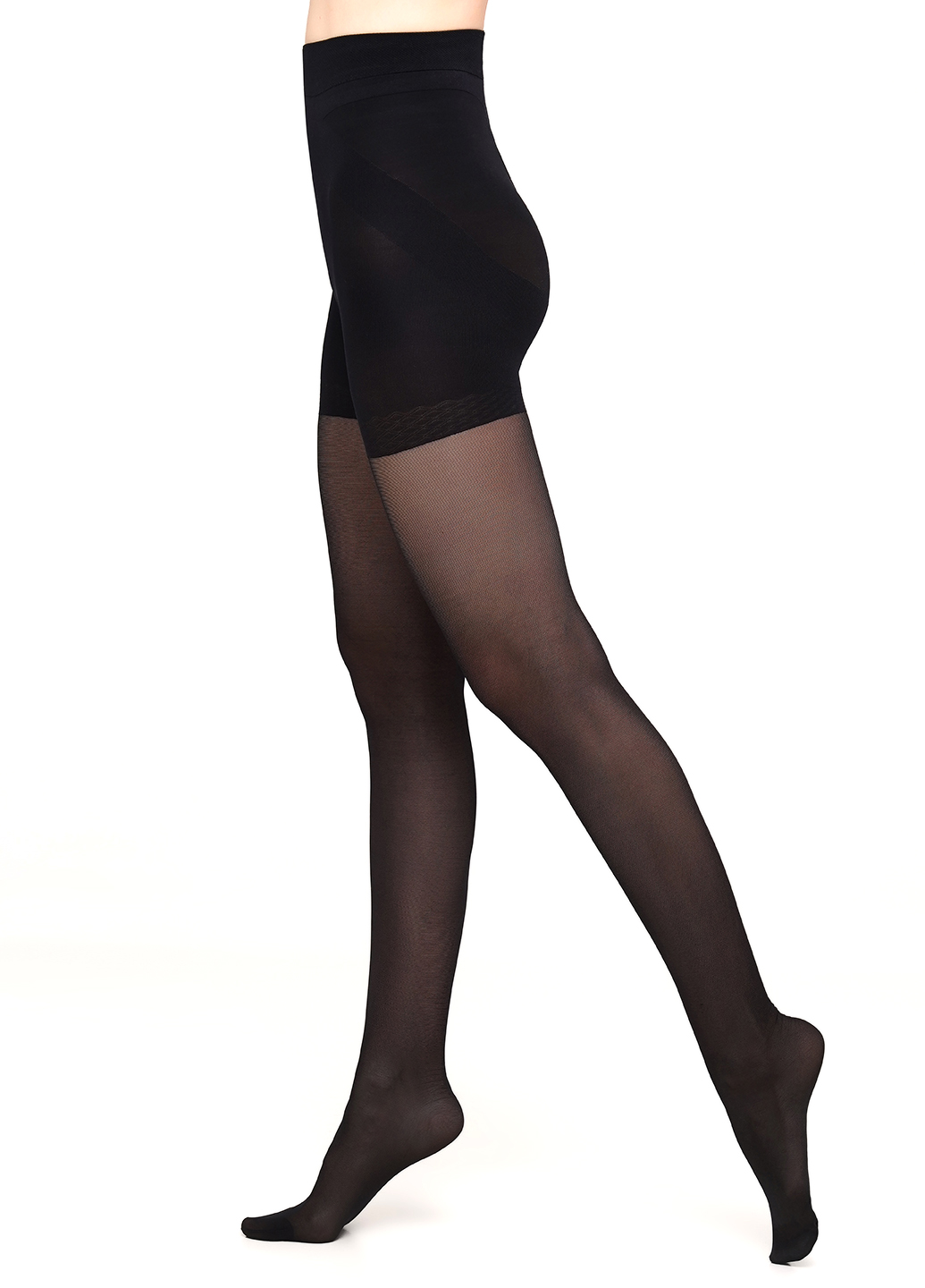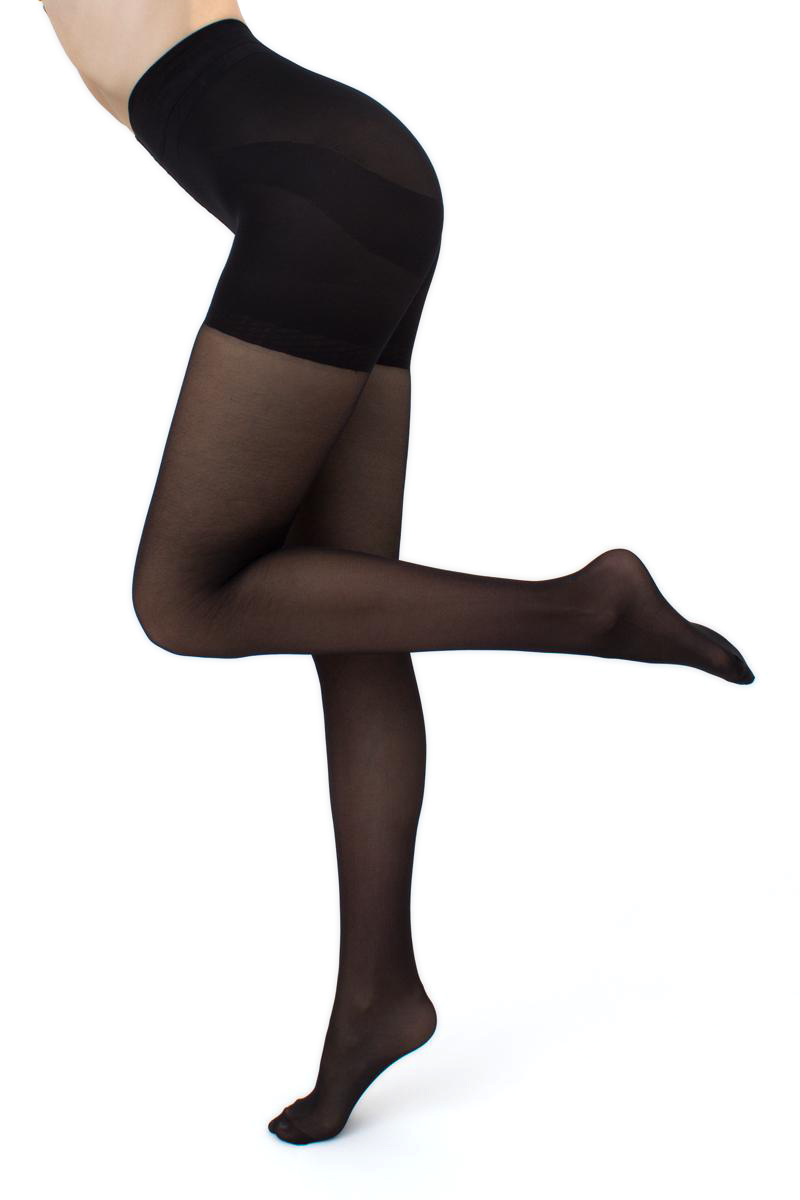 Strumpfhose mit figurformendem Höschenteil, formt die Hüfte und Oberschenkel, sorgt für einen flach aussehenden Bauch und schlanker wirkende Taille. Mit Push-Up-Effekt für den Po.
