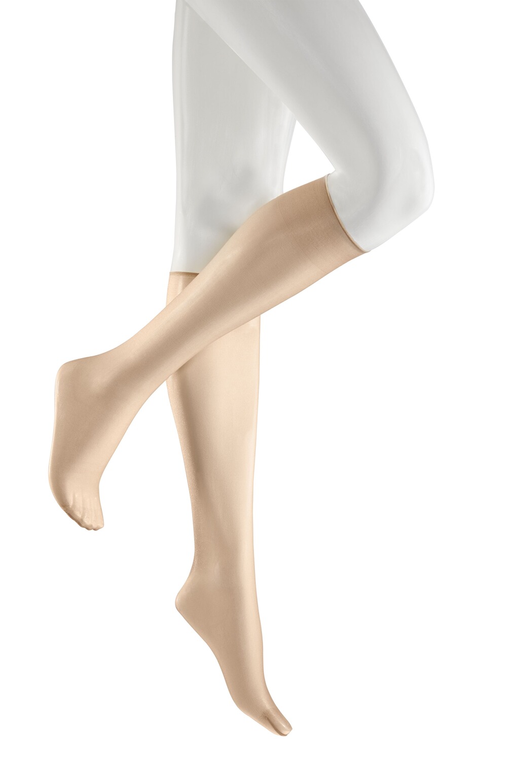 Ultra-transparente, leicht schimmernde Kniestrümpfe im Nude-Look - Durchgehend transparent für eine natürlich schöne Optik. Das druckfreie und besonders dezente Bündchen und die softe Mikrospitze bieten höchsten Tragekomfort.